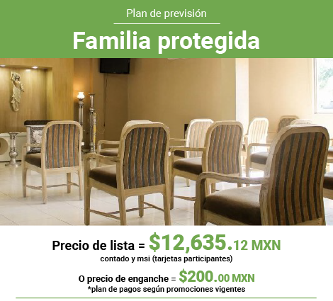 Adquirir un PLAN FAMILIAS PROTEGIDAS, es una solución que te ayuda de manera anticipada y planeada para el futuro, otorgando la opción de elegir el SERVICIO FUNERARIO según tus necesidades y gustos, además de pagarlo a cómodas parcialidades, dando la seguridad y tranquilidad que tú y tu familia necesitan en ese momento inevitable.